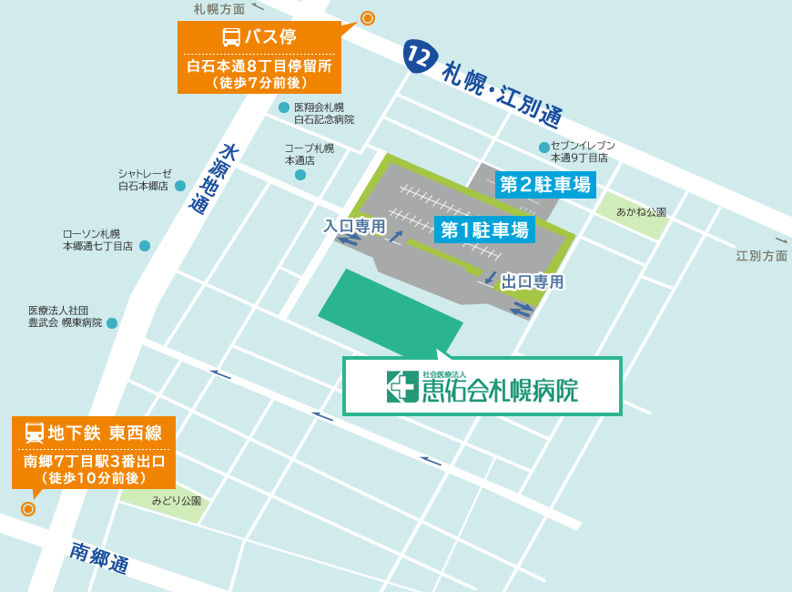 南郷7丁目 → 恵佑会札幌病院:徒歩(約10分)