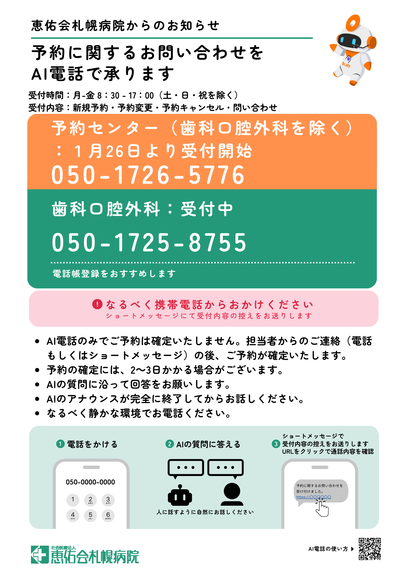 お知らせ 予約センター(歯科口腔外科を除く)の電話番号が変わります。 2026年1月26日(月)から、予約センターの電話番号が変更となります。詳しくは下記画像をご覧ください。※予約当日のお問い合わせや緊急性の高い内容については下記へご連絡ください。歯科口腔外科以外 ー 011-863-2101(代表)歯科口腔外科 ー 011-863-2105(直通) 前へ 1 2 3 4 5 6 7 次へ